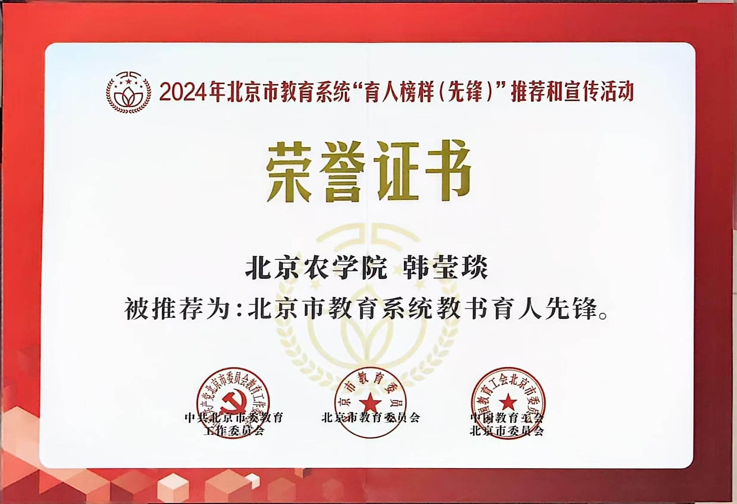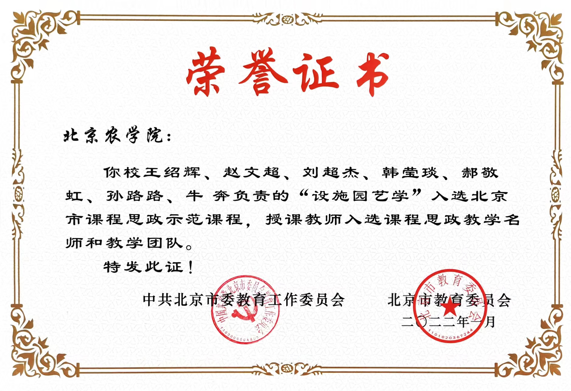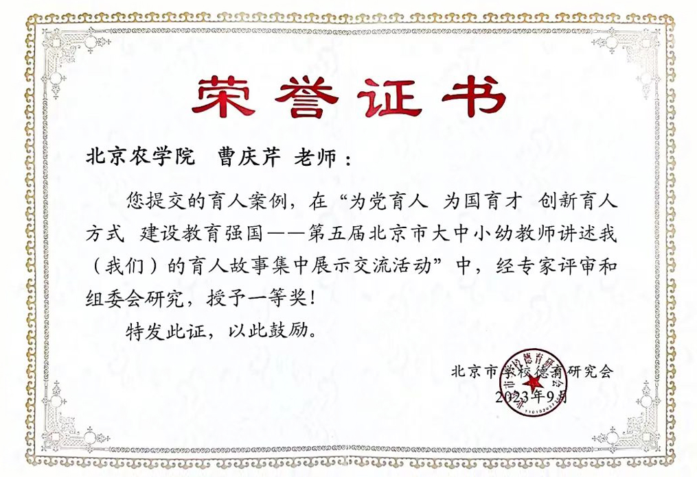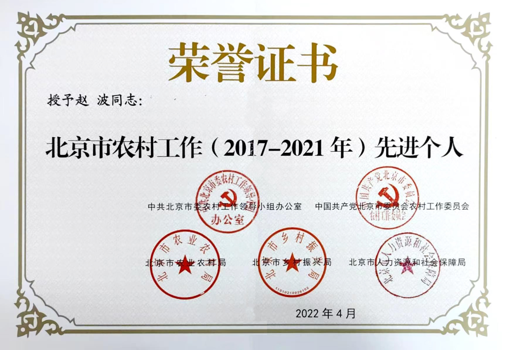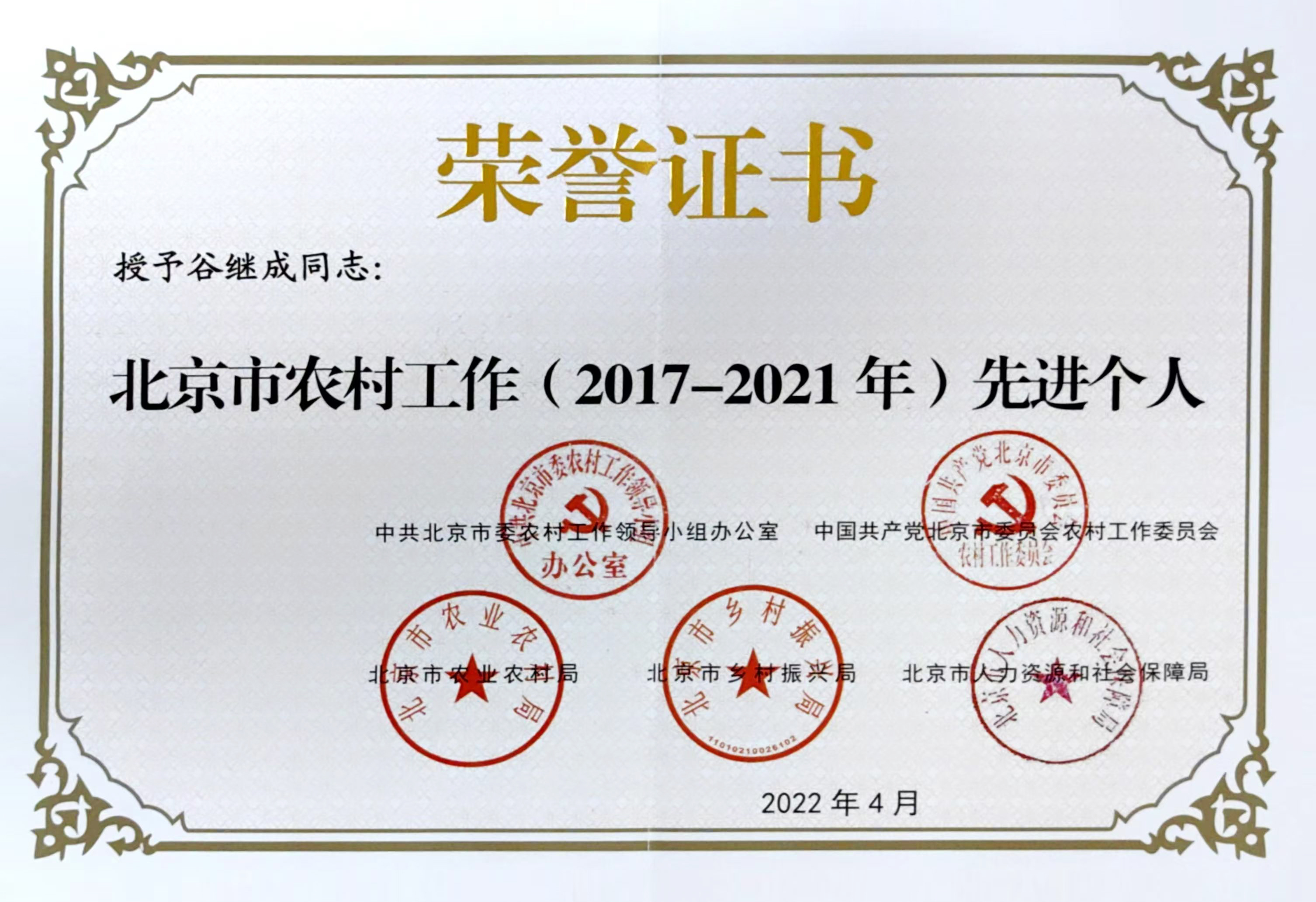 植科学院谷继成副教授、赵波副教授 荣获“北京市农村工作(2017-2021年)先进个人”称号