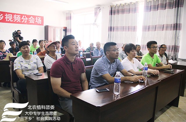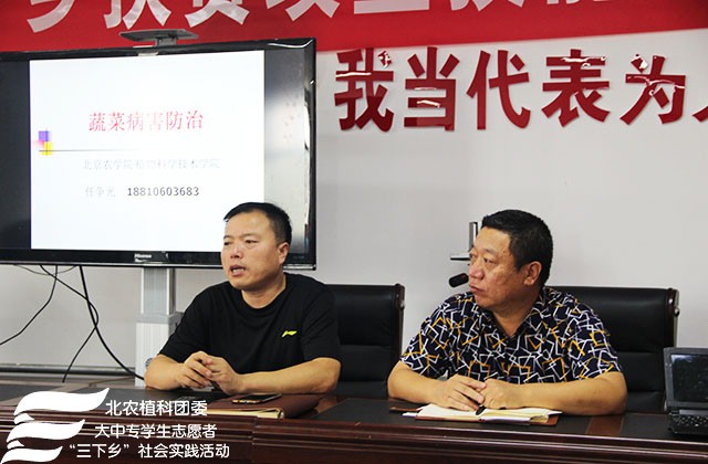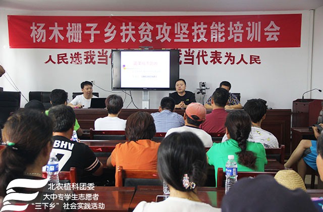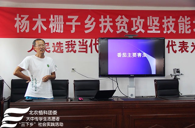 实践团到达杨木栅子乡政府所在地杨木栅子村后,欧乡长邀请植保专家参与“杨木栅子乡扶贫攻坚技能培训会”,为当地种植户讲解病虫害防治知识。