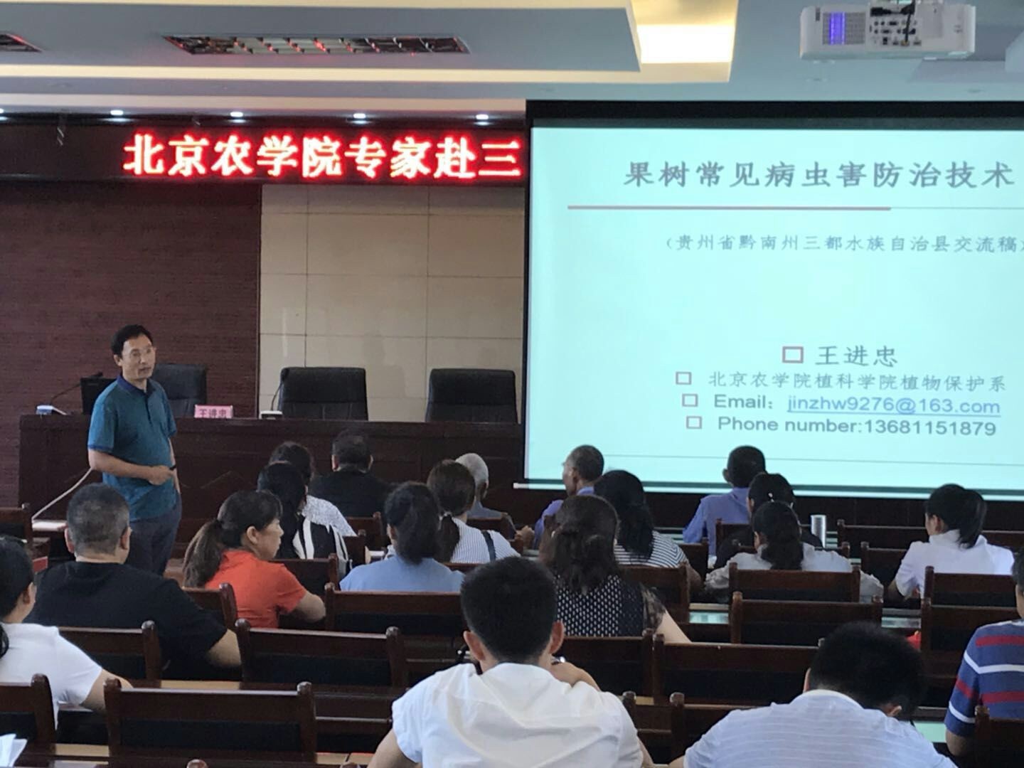 贵州三都是全国唯一的水族自治县,位于贵州省黔南州东南部,国土面积2400平方公里,总人口40万人,是典型的农业县,该县以黄桃、葡萄、蔬菜、生猪养殖、生态禽、食用菌、茶叶等为主导产业。8月4日,王进忠、张杰两位老师开展了培训和现场技术咨询,针对该县存在的种植品种老化,结构比较单一,病虫害逐年凸显和商品率较低等问题,进行了深入浅出的讲授和咨询工作,受到了参加培训的县农业技术干部、合作社技术人员和葡萄、黄桃等果树种植业大户等近百人的热烈欢迎。