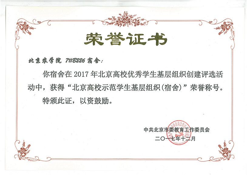 在北京市教工委组织的2017年北京高校优秀学生基层组织创建评选活动中,我院2016级学生宿舍7#B226荣获“北京高校示范学生基层组织(宿舍)”荣誉称号。