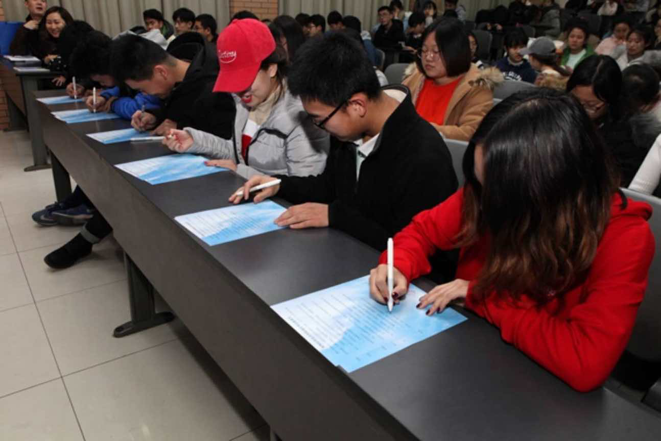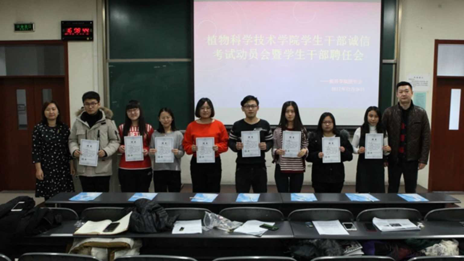 会议伊始,牛老师和郝老师为学生会主席团成员颁发学生干部徽章及聘书、两位老师及主席团成员为副部长及以上成员颁发聘书、并由学生会主席团成员为各班班长及班级代表、宿舍长及宿舍长代表颁发聘书。然后16级、17级班长上前签署了诚信考试承诺书,表达同学们诚信考试、积极备考的决心。