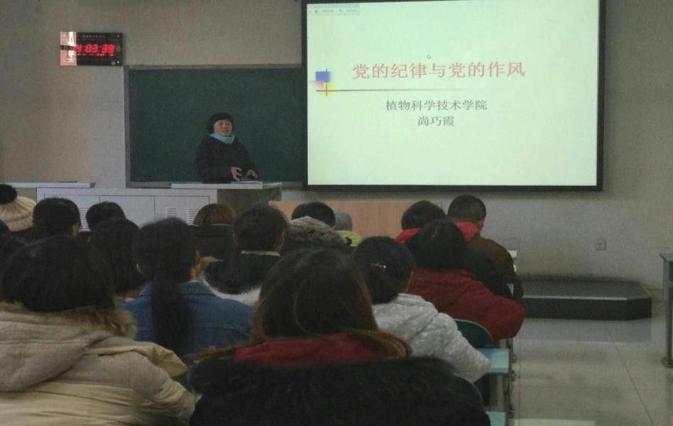 2017年12月11日,在教B107教室,植保学生党支部和资环学生党支部请到植科学院尚巧霞老师给学生党员讲党课,学习党的纪律和党的作风。本次党课学习有植保本科生党支部书记毕扬老师、资环本科生党支部书记梁琼老师以及植保和资环的学生党员参加