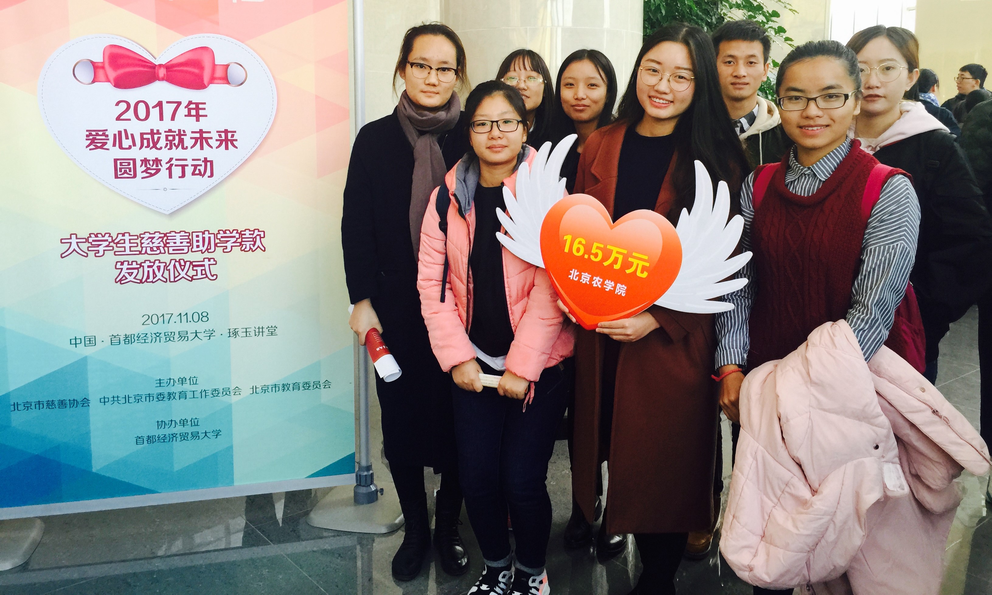 2017年11月8日,北京市慈善协会爱心成就未来圆梦行动大学生助学款发放仪式在首都经济贸易大学举行,永利23411集团受助学生代表学校参加仪式,并上台接受捐赠。