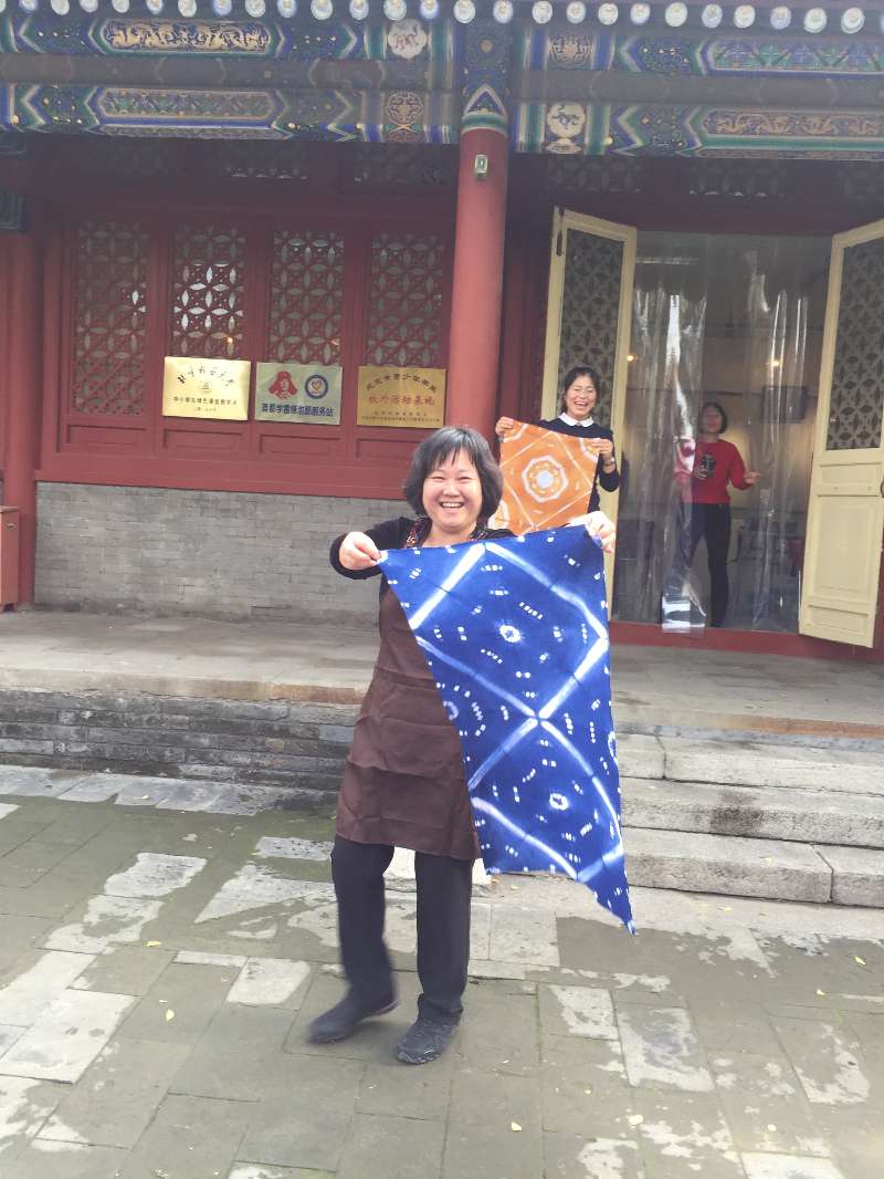 每个人的心里都没有底,手里拿着白布,摆弄来摆弄去,犹犹豫豫,不知怎么叠才好;桌上的工具也是选来选去,换来换去;心里还琢磨着到底染成什么颜色呢?是用三种颜色还是两种颜色染?最后干脆不管三七二十一,漫无目的、糊里糊涂地把白布叠成了自己都不能再次重复过程的半成品,放到了自己选择的染料缸里。经过染色、冲洗、再染色、再冲洗、固定、冲洗……几个步骤操作过后,终于到了拆掉工具、打开棉布,一展它真容的时候了。这是最激动人心的时刻,大家的目光不约而同地聚集在第一个正在打开的作品上,迫不及待而又满心激动地小心翼翼一点一点打开湿漉漉的染布的那一刻,所有人的目光都集中到这个作品上,紧紧盯着它,看着它一点点被揭开神秘的面纱。那个过程令人屏息、令人兴奋、令人欣喜,至今仍令人回味无穷……,那种感觉真是妙不可言!让我们吃惊的是我们每个人都是那么成功,我们的每个作品都是那么漂亮,而且独一无二。