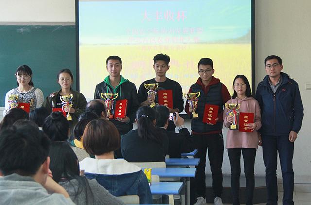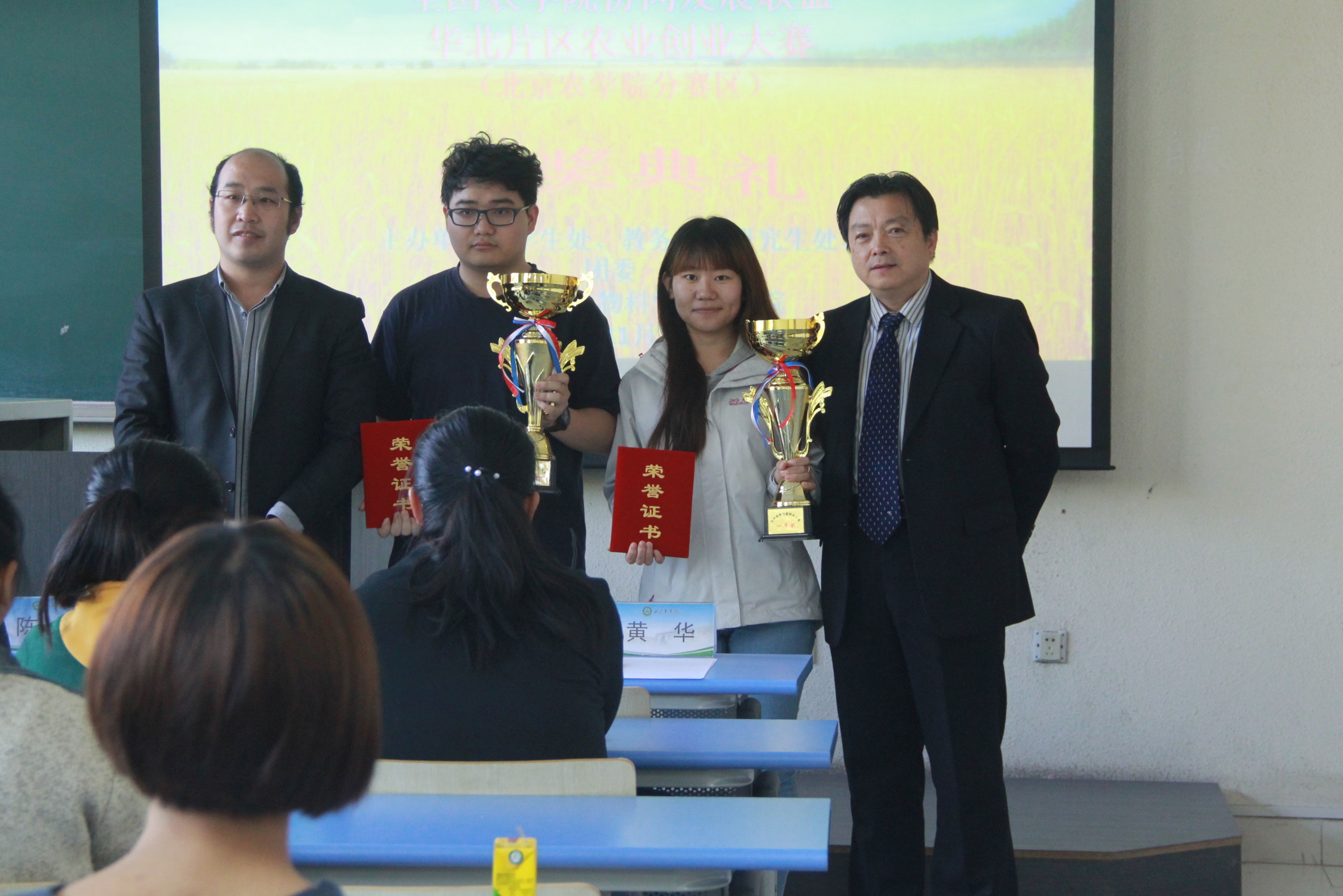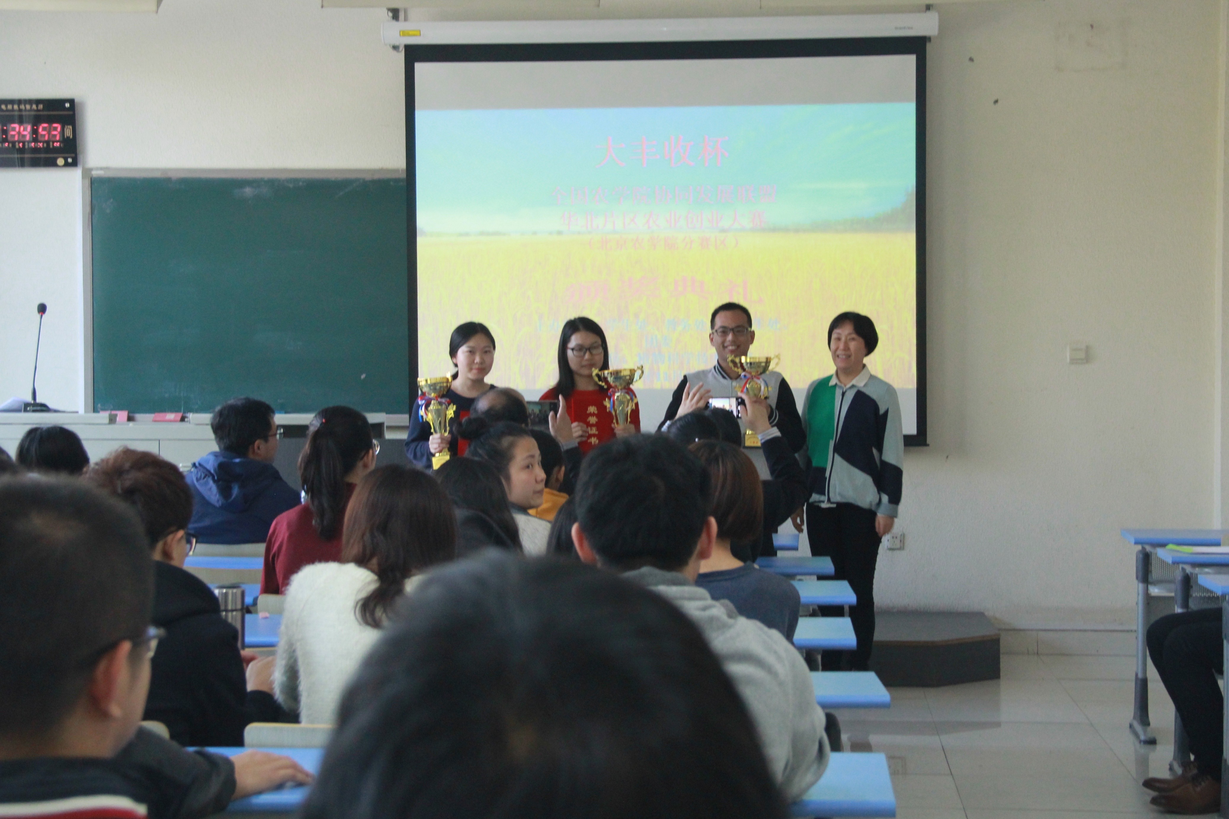 首届“大丰收杯——全国农学院协同发展联盟华北片区农业创新创业大赛(yl23411永利集团分赛区)”于10月26日圆满举办。经过6个学院,15个创新创业项目团队的精彩答辩,共产生一等奖两个,二等奖三个,三等奖六个。由黄华、黄杰、赵晓萌、陈勇四位老师分别为一、二、三等奖的同学颁奖,台下爆发出热烈的掌声。