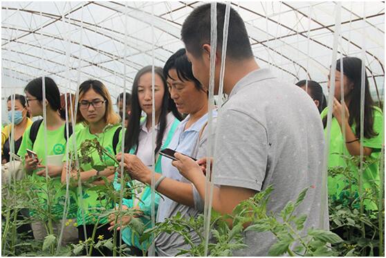 实践团首先参观的是冷棚硬果西红柿。相关专业老师对农户反映的技术方面的困惑进行了耐心的解答,对植株的病理进行了分析研究,在合理种植、提高大棚收益等方面提出了合理化建议。
