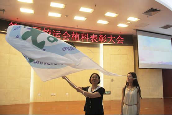 大会最后一项,运动会会旗交接仪式。学院党总支书记王绍辉与院学生会主席陈馨蕊郑重的对接了下一届运动会会旗。会旗在会场飘扬,表达了植科学院对第38届运动会开闭幕式无私奉献的决心。