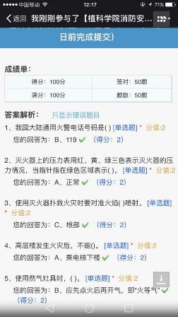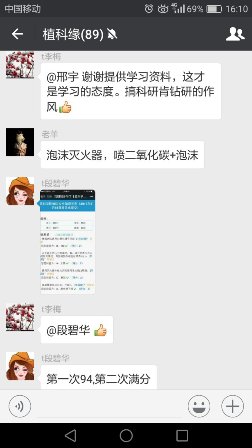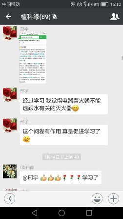 为培训师生员工掌握消防安全知识和基本技能,提高广大师生消防安全意识和火灾防控能力,学院精心收集了消防安全知识学习资料,并制作了微信版的消防安全知识答卷,提交后会显示得分和正确答案。在植物学院教师群、学生群中一经发布,师生们答题踊跃。很多老师都是一遍一遍地反复答题,直到得100分为止,并把截图晒给大家看,大家都在互相比,互相晒,气氛热烈。甚至有的老师还对题目中的某些难掌握的问题展开讨论,还有的就该问题有在网上查了资料给大家分享,供大家学习。这种认真劲让我们很感动。