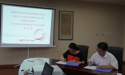 会上,农学教师支部书记李润枝与马列教研室党小组组长马宁签署了共建协议。双方党支部成员围绕全国高校思想政治工作会议精神展开认真讨论,并交流心得。纷纷表示将进一步深入学习领会全国高校思想政治工作会议精神,坚持立德树人的宗旨,加强理论研究,专业知识与思想政治教育相结合,增进课堂对学生的吸引力,提高服务育人能力,为学校的各项事业发展做出更大的贡献。