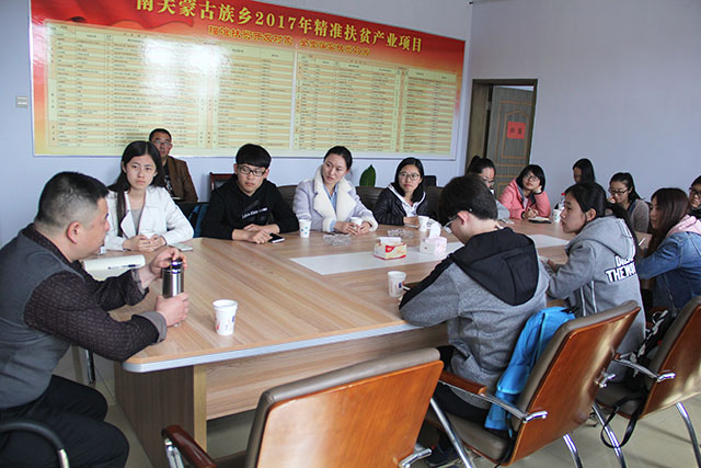 中午11:40,实践团到达了南关乡乡政府。在会议室内,县政府的李楠科长简略的为实践团介绍了一下丰宁总体的贫困现状、产业基础优势、主要的生产方式以及正在实施的扶贫政策。丰宁县有10镇16乡,309个行政村,40.9万人。国家级贫困县、十个重点支持的深度贫困地区、河北省农业大县、有耕地139万亩。2016年开始县委县政府提出产业扶贫全覆盖,让每一个贫困人口依托产业有经营性或财产性收入。接下来王书记详细的为实践团介绍了南关村、两间房村、独立营村等村的贫困现状,各村正在种植的作物和作物的收益情况。最后,王书记提出了多种希望大面积种植的作物,其中以金花葵为主。希望实践团帮助论证一下其经济价值与观赏价值是否并存,是否适宜种植。王书记还对于南关乡的千亩设施,暖棚以及园区规划等提出了构想,希望实践团可以运用起我们的专业知识,一起努力,希望南关乡逐步发展起来。