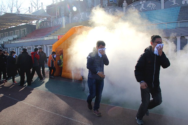12:30,演练正式开始。冒着浓烟的模拟火场着实让同学们吓了一跳,但是有了李老师所说明的正确逃生姿势,同学们用湿毛巾捂住口鼻,排着队依次穿过了模拟火场。在学生们演练完成之后,包括院办公室主任李梅在内的老师们也进行了这次模拟的逃生演练。
