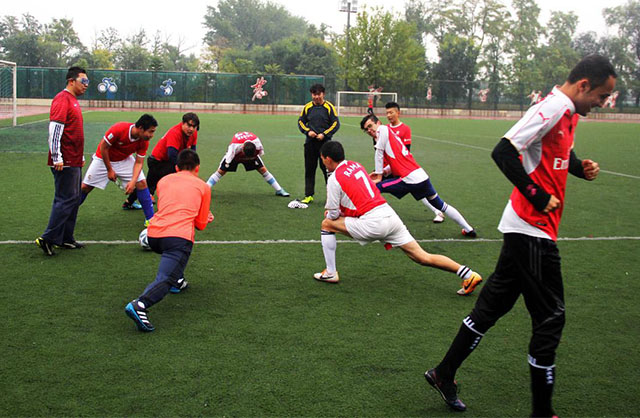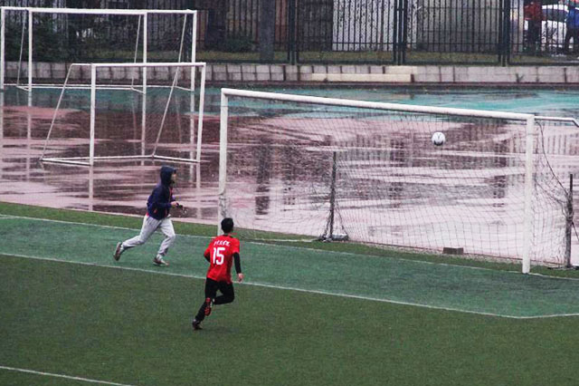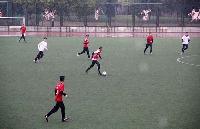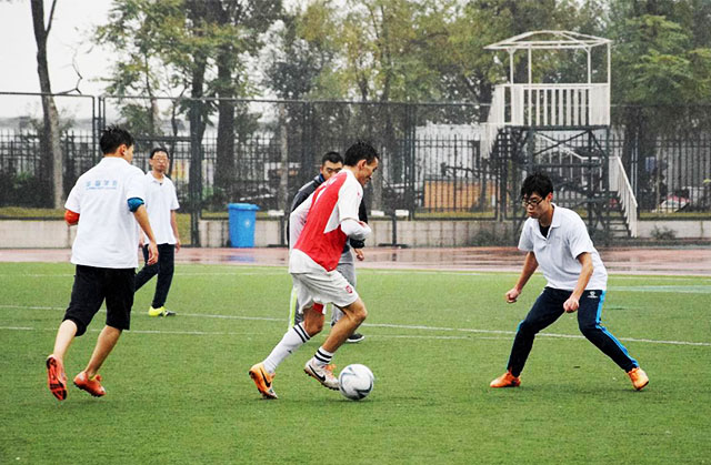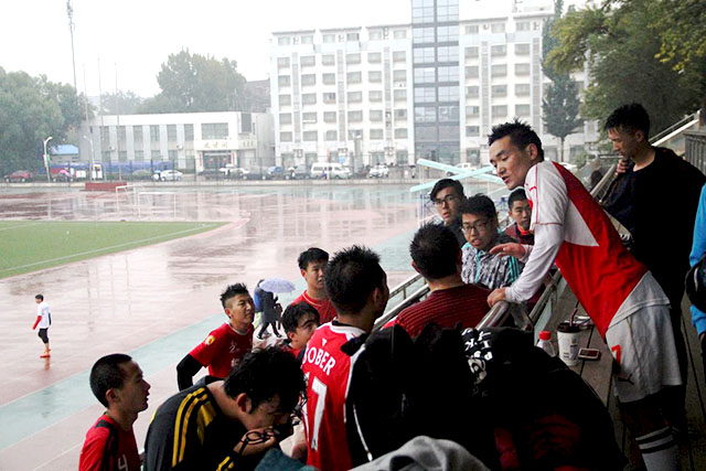 10月27日下午3点30分,永利23411集团足球队与国际学院足球队在操场上举行了一场足球小组赛。3点左右,运动员们冒着风雨,在满是水洼的球场上开始热身。