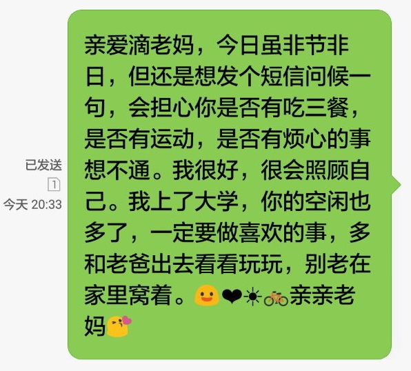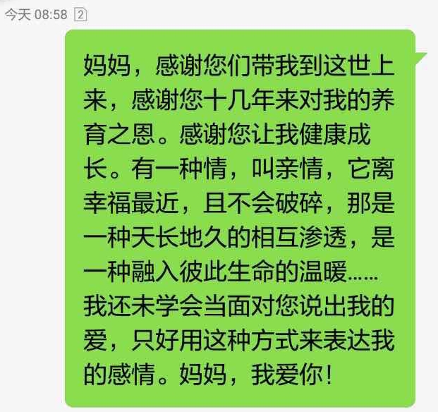 短信,不打扰干涉,只表达关怀,最朴素也最从容。当两个世界之间,推开一扇小小的窗,便会有阳光春风,催开群花盛放。在现在一个矛盾的年代,最应亲近的心灵日趋封闭。一条小小的短信,表达了学生对家长的感恩。