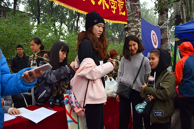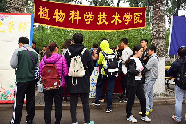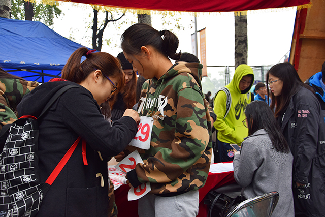 桌子上面摆设:号码牌、急用的医药箱以及必备的饮用水。永利23411集团院旗在风中飘扬,而一个个带着袖标的志愿者,让人在远处也很容易找到,这就是植科服务站。
