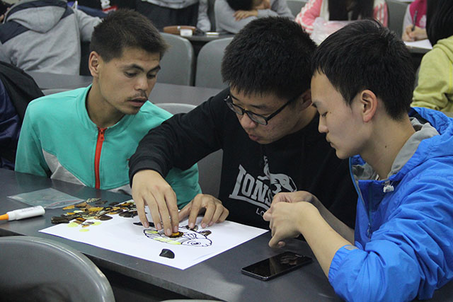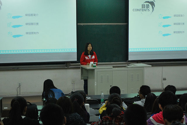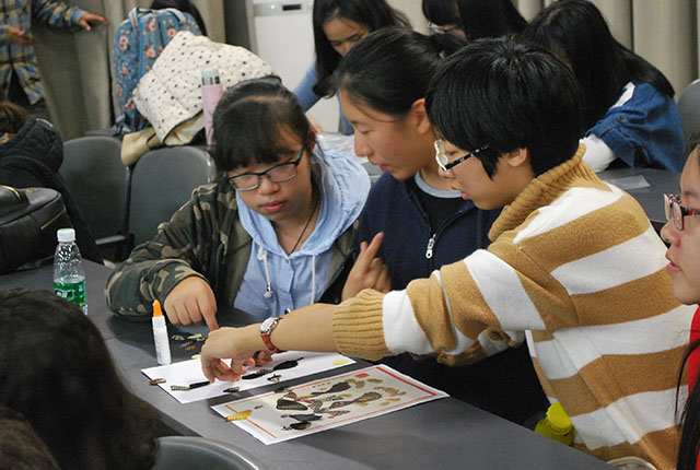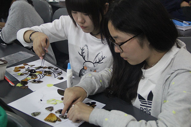 开场由15级的张璇,许佟为新生们系统介绍了蝶翅画的来历,制作方法与技巧。蝶翅画是以蝴蝶的翅膀为材料,利用其色彩、光泽以及纹理结构等特点,将形状、大小不同的翅坯粘贴在画板上而形成的手工工艺品,是植科学院的特色产品。同学们沉醉其中,用心制作出了精美的艺术品:北农美景、北农校徽、北农特色,同学们的作品表达出他们对校园深深的热爱,对迎接北农60华诞的激动心情。