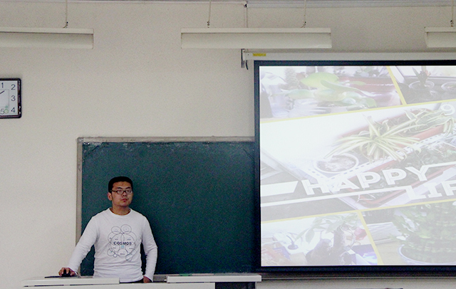 交流会开始,几位优秀绿色宿舍的代表上台交流分享了绿色阳台的种植经验。其中122宿舍代表王志龙提出了因地制宜、废物利用、合理安排空间这三点种养植物的经验。121宿舍代表王瑞向大家介绍了养护绿植时位置选取、阳光利用和土壤选取的技巧,其他几位宿舍代表也分别介绍了自己宿舍不同种类的植物。
