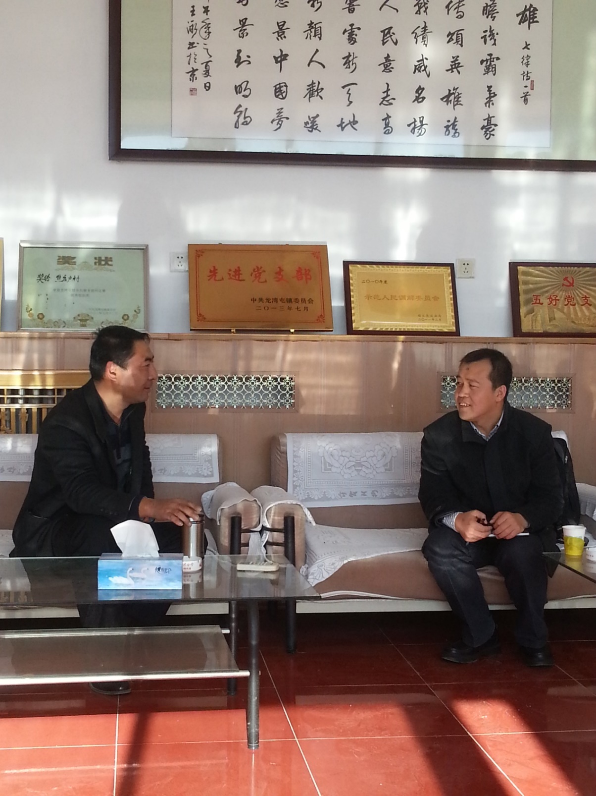 韩书记介绍了焦庄户村的基本情况,焦庄户村全村约480户,1400人,紧邻焦庄户地道战遗址。焦庄户村2003年被北京市农委、市旅游局确定为市级民俗旅游村,2010年被评为第五批中国历史文化名村。韩书记还介绍了该村主要的经济活动,如民俗旅游接待,以及该村的农村土地流转、平原造林工程、生态补偿事宜等。