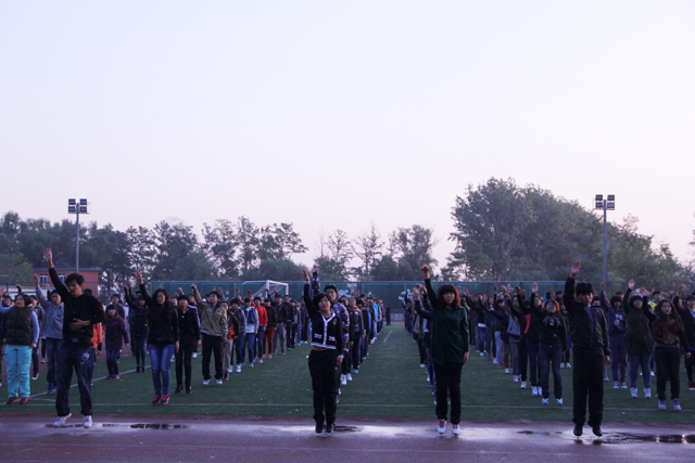 早晨6点40分我院的学生就早早的来到操场,为了展现我院的风采,我们学院的学生统一着深色服装。比赛开始,同学们一个个都精神饱满的站在操场上,他们的舞姿整齐划一又充满活力。正所谓奇舞飞扬,舞动青春,大一新生活力无限。