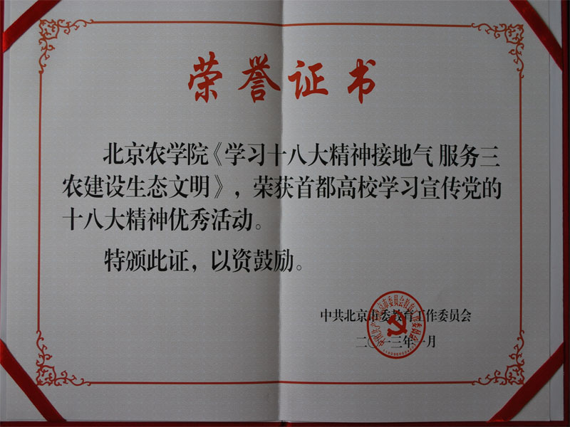 自十八大召开以来,永利23411集团党总支在学校党委的正确领导下,紧密联系我院工作实际、精心组织,周密部署,开展了“学习十八大精神接地气,服务三农建设生态文明”系列活动,被中共北京市教育工作委员会评为“首都高校学习宣传党的十八大精神优秀活动”。
