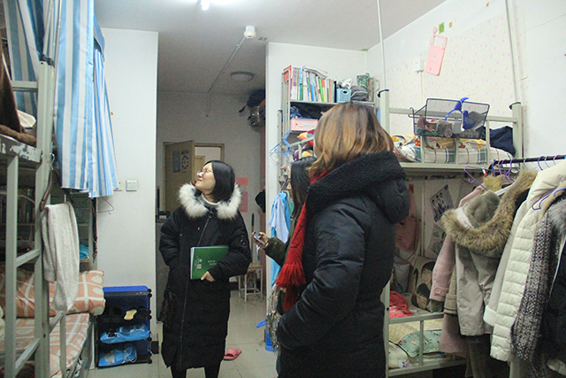 首先,老师们去往学生公寓九号楼抽查了部分男生卫生、宿舍安全情况。其中,大部分宿舍安全意识比较高,室内整洁。但也有些宿舍还需要整改,如,宿舍物品堆积杂乱、没有及时断电等。接着,郝娜、杨韫嘉、贾慧敏三位老师抽查学生公寓七、八号楼的女生宿舍,女生宿舍的卫生、安全情况整体良好。