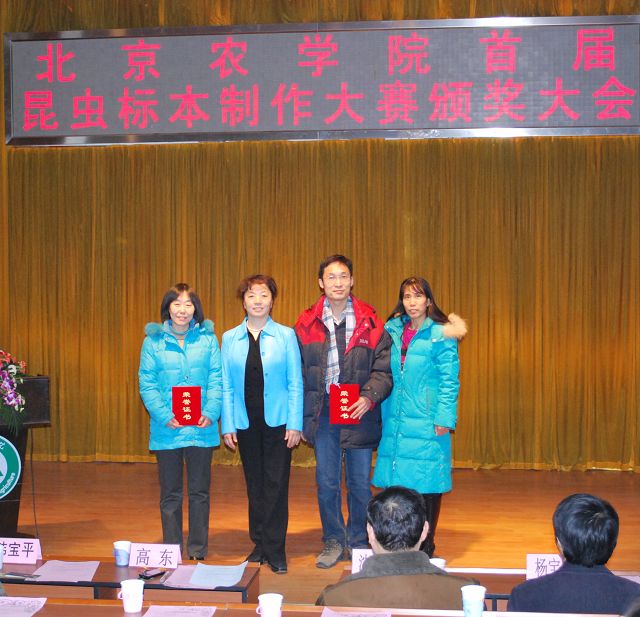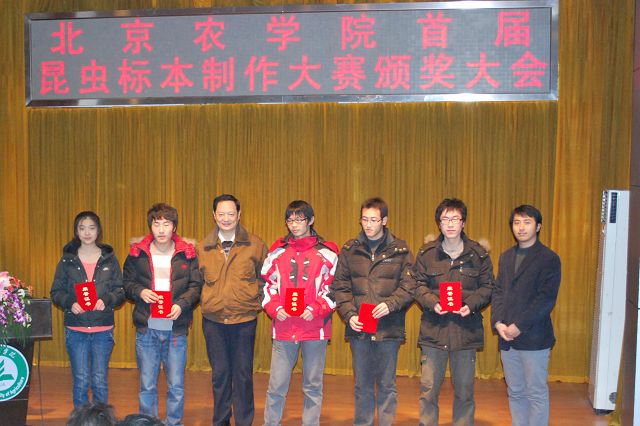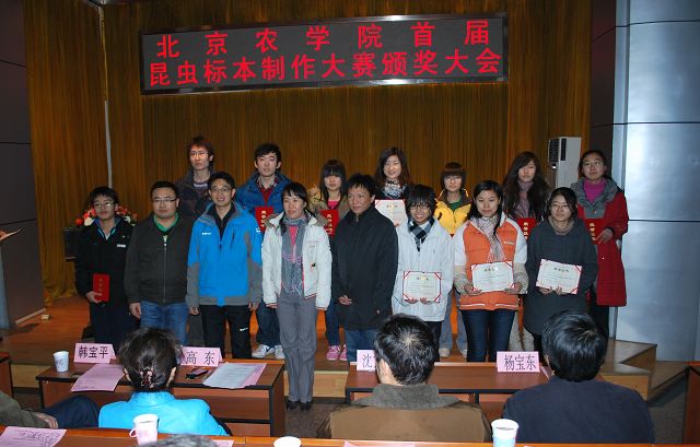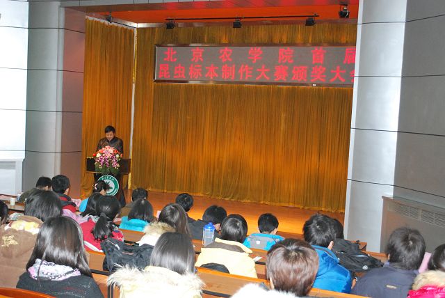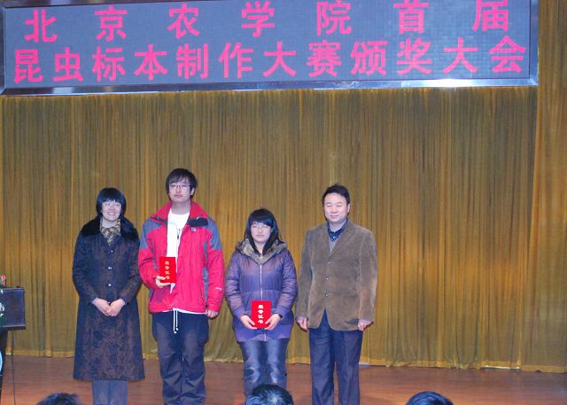 yl23411永利集团首届昆虫标本制作大赛由教务处、学生处、校团委主办,永利23411集团承办,各二级学院和虫虫一角社团协办。12月13日12点50分,yl23411永利集团首届昆虫标本制作大赛颁奖大会在小报告厅隆重召开,大会表彰了标本制作活动中的优秀学生与优秀指导教师。校党委副书记高东、学生处处长韩宝平、图书馆馆长杨剑平、教务处副处长沈文华、校团委书记杨宝东、各学院副院长赵晓萌、刘柳、李相阳、范小强,动科学院辅导员赵小艳、园林学院辅导员廖常规,作为嘉宾应邀出席,植科学院副院长王绍辉、张喜春、赵金芳,指导教师王进忠、孙淑玲、杜艳丽以及学院辅导员和学生代表参加大会。大会由教学副院长张喜春主持,副院长赵金芳老师首先简单介绍了昆虫标本制作大赛的情况,并和大家共同回顾了大赛的历程。副处长沈文华宣读了本次大赛获得奖励得同学和优秀指导老师的名单,在场的领导为老师和同学们颁发了荣誉证书。