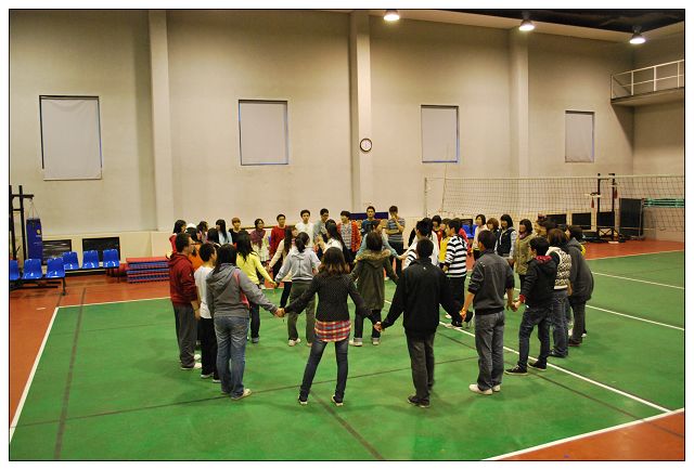 比赛即将接近尾声时,信息中心指导老师贾慧敏带着大家做最后一个游戏--“心有千千结”。游戏意在让每个人的微笑和快乐互相传递,同时也让信息中心的每位成员感受到:只要大家心往一处拧,劲往一处使,一切困难都可以克服,一切难题都可以解开。
