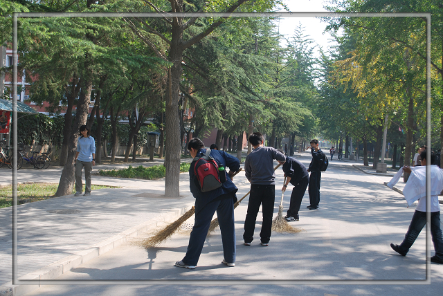 活动中,同学们积极认真地对学校街道进行了清扫。女生们认真地拣出草地、街道旁的烟蒂纸屑。男生们挥舞着扫帚,将街道的片片落叶打扫的干干净净。“校园干净了,同学们学习生活的环境就更好了。”班里的同学笑着讲到。