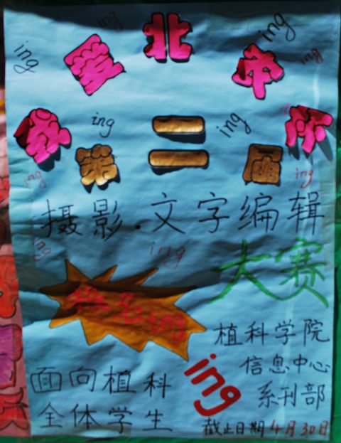 3、 同学们可以在2009年12月9日发布的永利23411集团信息中心首届“我爱北农杯”摄影、编辑排版创意大赛作品展示上看到获奖作品以供参考。
