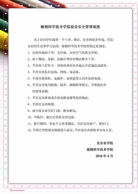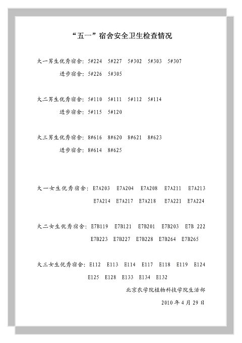 在上海世博会、五一国际劳动节来临之际,为使学生安全、快乐度过假期。4月27日,植物科学学院学生会生活部组织各年级各班级生活委员召开宿舍卫生、安全管理会,强调宿舍卫生以及假期安全问题。