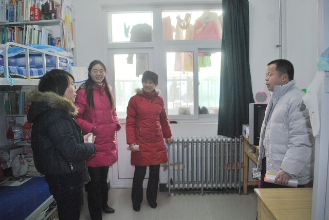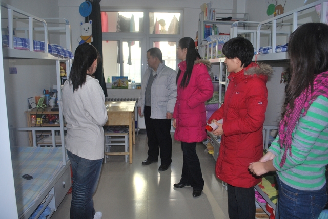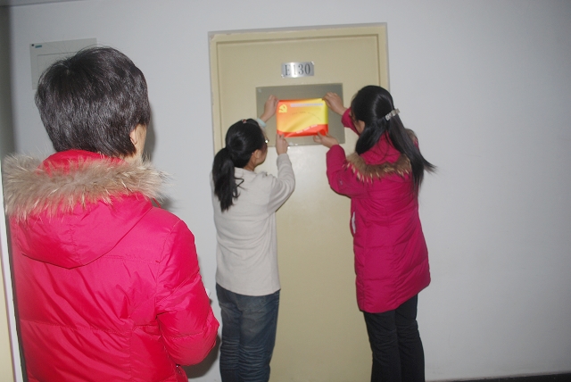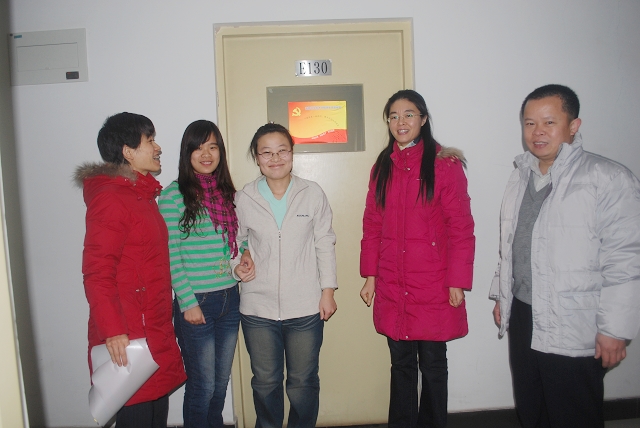 几位老师首先到8、9号楼的学生党员宿舍进行参观,整齐、清洁的宿舍情况得到了老师的好评。副院长赵金芳勉励党员同学要保持宿舍卫生整洁,同时强调党员示范宿舍的作用就是发动全体党员、带动广大同学,力求每位党员都是一面旗帜,都能起到带头作用,不仅仅在宿舍区示范带头,更要在各个方面起到先锋模范作用。最后几位老师和宿舍的党员同学一起张贴示范牌。