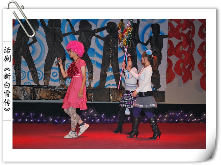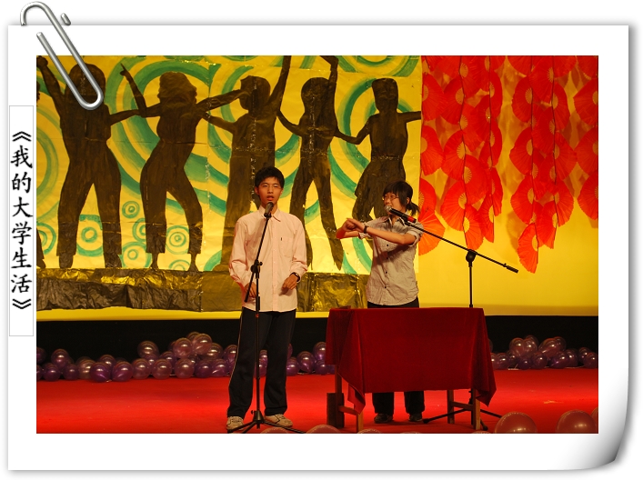 相声《我的大学生活》讲述了大学生活的各种趣事,充分体现了同学们初到大学的新奇、兴奋、烦恼和意外。话剧《新白雪传》以反串形式,配上诙谐的语言、夸张的动作和新颖的故事情节深深感染观众,幽默搞笑的节目让全场笑声连连,从而达到让大家放松心情的目的。