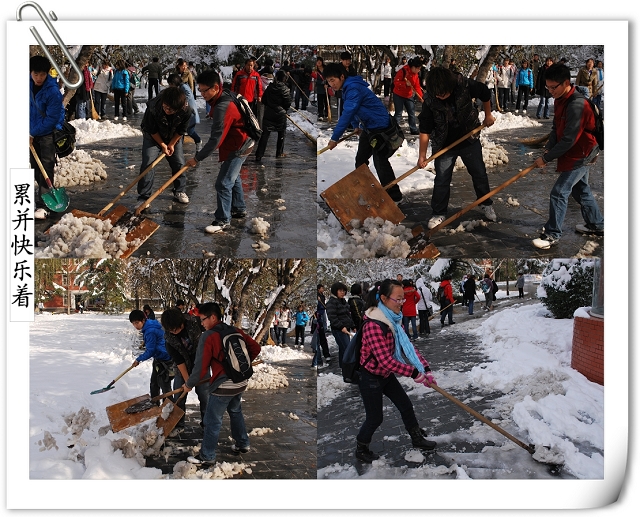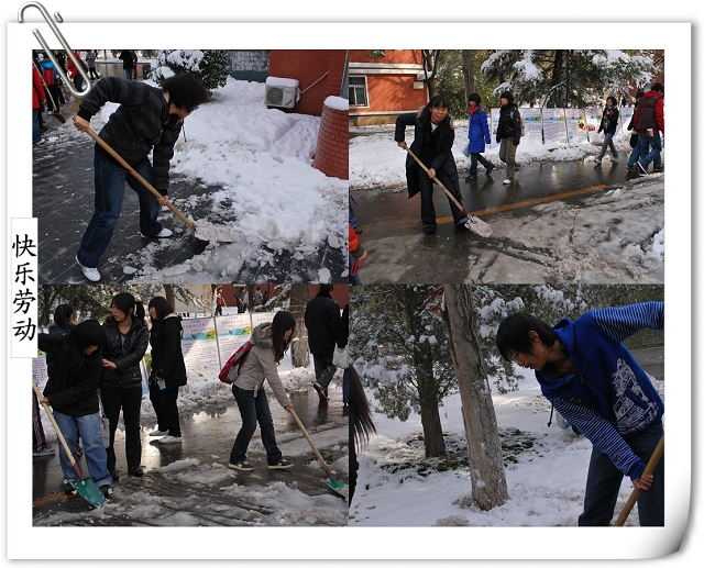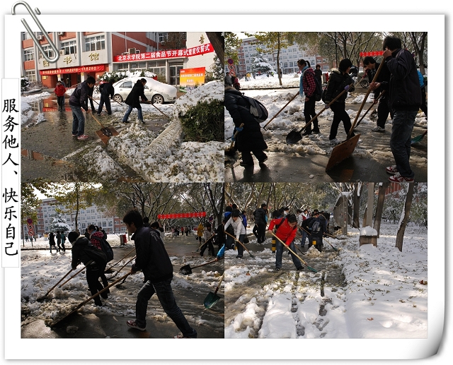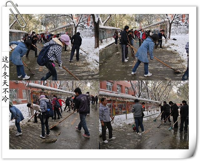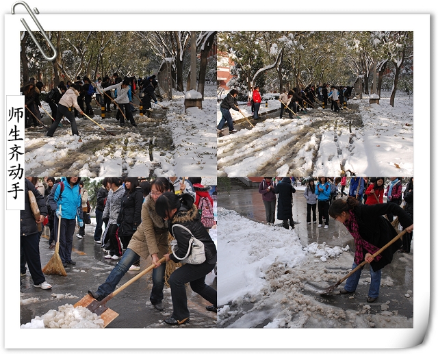 师生齐动员的场景引得路人的赞叹,同时得到后勤集团及学校个别部门的支持,为大家提供铁锹、铁锨、扫把等工具。争先恐后、你帮我扶,在大家半个小时的努力下,通往办公楼的南北路、去往一二食堂的大道小路、图书馆门前,变得畅通无阻,消融的积雪不再侵蚀师生的鞋子,而成为树木的最好浇灌积水,灿烂的笑容、师生互助的情景,成了今天别样美丽的风景线,更多的是为全校师生的工作和学习带来了方便。