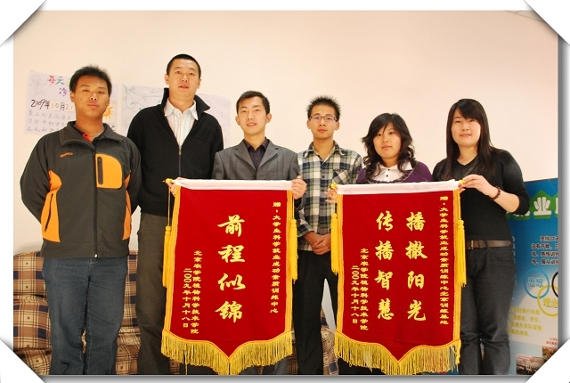 两面红色的锦旗分别印有“前程似锦”、“传播智慧 播洒阳光”的标语。这两句话真切的表达了永利23411集团对训练中心中几位教练最诚挚的谢意,感谢他们对本院大学生创业就业协会成员的指导,以及对全院学生在就业、创业、素质拓展、干部培训等提高学生素质方面所付出的辛勤劳动。希望能在今后得到各位教练老师的支持和帮助。