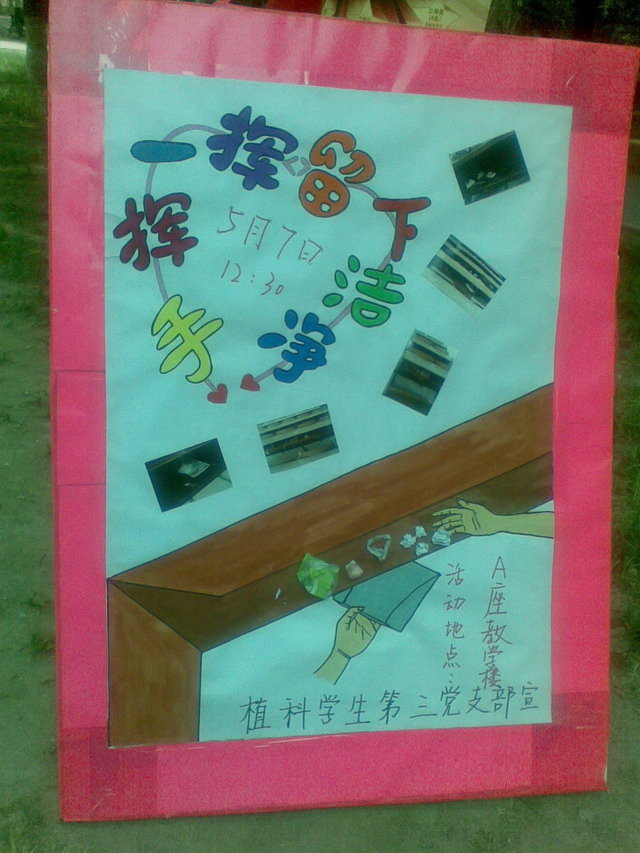 为更好的践行科学发展观,加强教室环境的整洁,保持良好学习环境。我植物科技学院学生第三党支部,特向全体同学发出“我挥一挥手,留下一片洁净”的倡议: