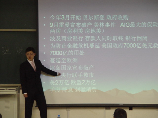 刘先生就当前美国华尔街金融危机与1929年曾经爆发的全球金融危机进行了对比分析,以一张生动丰富的图画,向在场的同学们解答分析了此次爆发金融危机的主要和根本原因是美国的金融政策和美元的大量发行造成的。李先生将当前的理财理念分为基础理财、保资理财、投资理财和投机理财四个部分,就当前的局势为大学生如何理财作了细致的引导和规划。在场的同学提到很多理财上遇到的问题,刘先生耐心解释,并为一些在炒股和将要准备创业的同学作了指导。