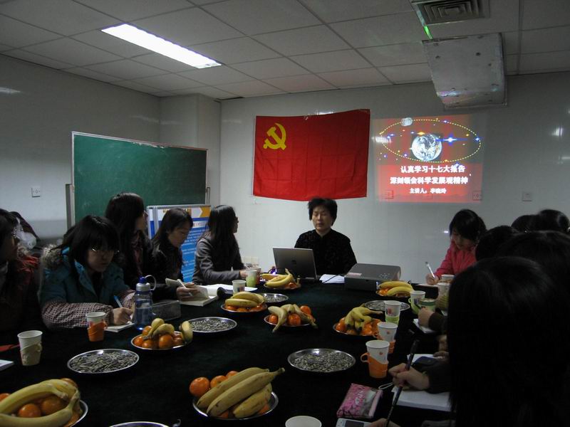 为进一步学习、理解和贯彻党的十七大会议精神,11月29日晚7:00植物科学系研究生第一支部在实验楼B427召开了“解读十七大报告,重温誓词,加强党性”的党日活动。研究生第一支部及学生第一支部全体成员和各支部书记代表参加了此次活动,会议特别邀请原人文系教授李晓玲老师做了题为“认真学习十七大报告、深刻领会科学发展观精神”报告。之后以茶话会的形势展开讨论,交流心得。
