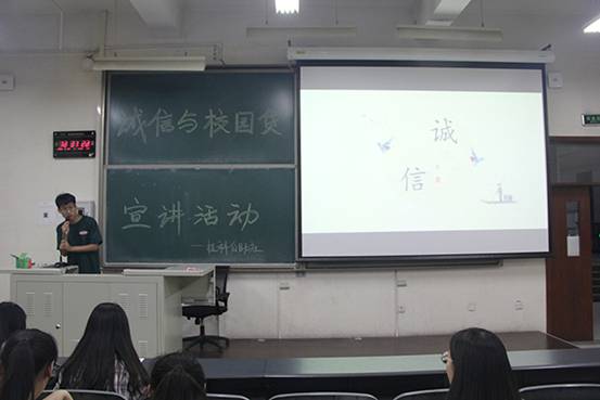 活动开始前,工作人员提前到场进行准备工作,同学们有序入场进行签到。活动首先进行PPT宣讲,向同学们展示古往今来的诚信美德,并倡导大家坚持诚信的原则,弘扬我国优秀的传统文化。接下来讲解了有关校园贷的知识和危害以及拯救措施,同学们认真聆听并且做出反馈。宣讲结束后,是紧张的八分钟有奖竞答。随后自助社社长向大家宣读了诚信倡议书,并邀请大家在观看宣传片的同时在倡议书上签字。同学们在观看完两部宣传片之后发出感慨,表示以后一定会注意这些方面的问题,并会提醒身边的同学诚信为本,远离校园贷!最后主持人宣布有奖竞答的获奖名单。