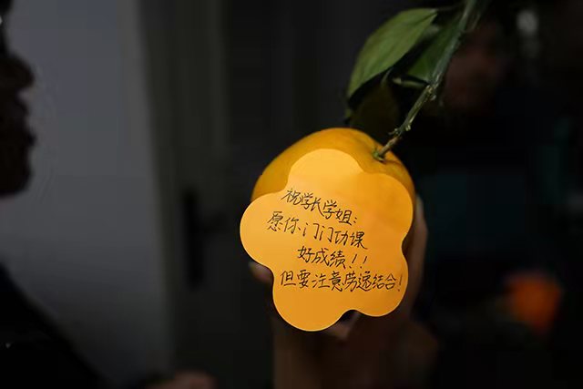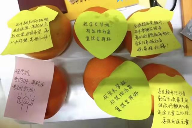 橙,寓意“成功”,承载了学院领导对2020届考研学子的殷切关心与期望。每一个香甜的橙上还加入了老师、同学们浓情的祝福,各具特色,“橙”意满满。植科学子们通过努力战至今日,从未停止学习的步伐。深夜寂静的教学楼中,满是他们身着冬衣挑灯夜战的背影;天刚蒙蒙亮,考研学子已奋笔疾书,抓紧一分一秒学习;图书馆满座,已成我校每日标配。大战在即,学院送上橙子,带给考研学子一丝甘甜,更是带去植科学院深深地祝福,祝他们勇攀高峰,马到“橙”功。