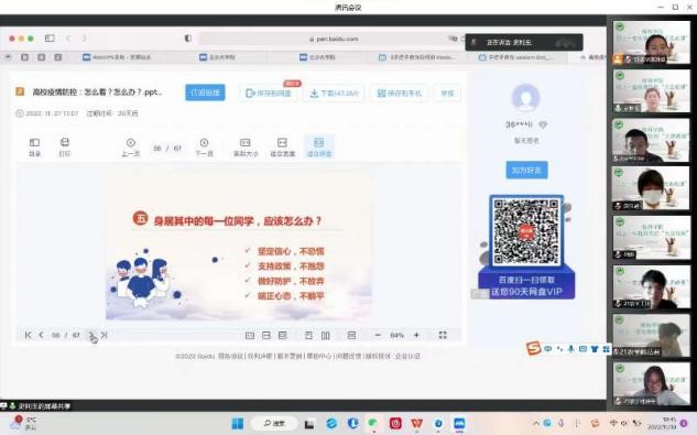 会议上,由各班班主任、辅导员给同学们讲解了当今高校疫情形势的严峻性,传达了当今高校的疫情防控政策。首都各大高校启用人力、物力,在确保师生生命安全和身体健康的前提下,及时启动线上教学、云端授课的模式,积极落实疫情防控政策。同时提醒离校学生和在校学生都要积极遵守当地防疫政策,按时核酸,减少出行,用正确的眼光看待疫情。