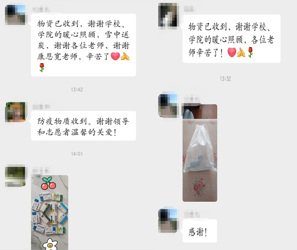 各位应急工作组的“爱心大使”不顾天气寒冷,将一份份暖心的物资及时送到老师们手中,看到他们忙碌的身影,老师们深受感动,纷纷表达了对学校、学院暖心工作的感谢。家住平谷、怀柔等郊区县的,各位“爱心大使”也及时快递邮寄到家,确保每份物资准确安全送达。