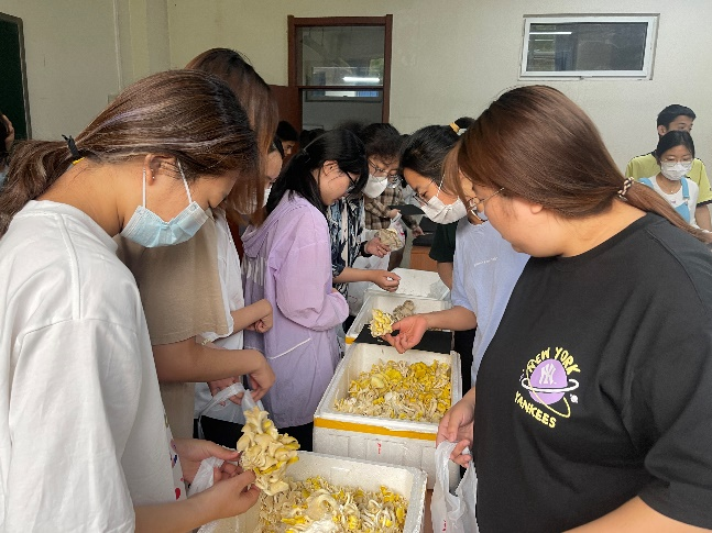 在张老师的讲解之后,整个教室的欢乐氛围在社团向同学们发放蘑菇、卡纸等制作材料的过程中达到了高潮。至此,“学农爱农,强国有我”——yl23411永利集团第二届食用菌孢子印画大赛正式拉开序幕。