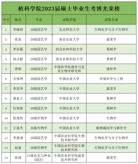 永利23411集团2023届硕士毕业生134人,考博上岸人数14人,考博率首次突破10%。6人被中国农业大学录取,3人被中国农业科学院录取,2人被西北农林科技大学录取,其余3人分别被北京师范大学、南京农业大学、中国科学院录取。千淘万漉虽辛苦,吹尽狂沙始到金。祝贺2023届考博学子取得佳绩,愿大家在今后的学习生活中继续努力,以梦为马,不负韶华。