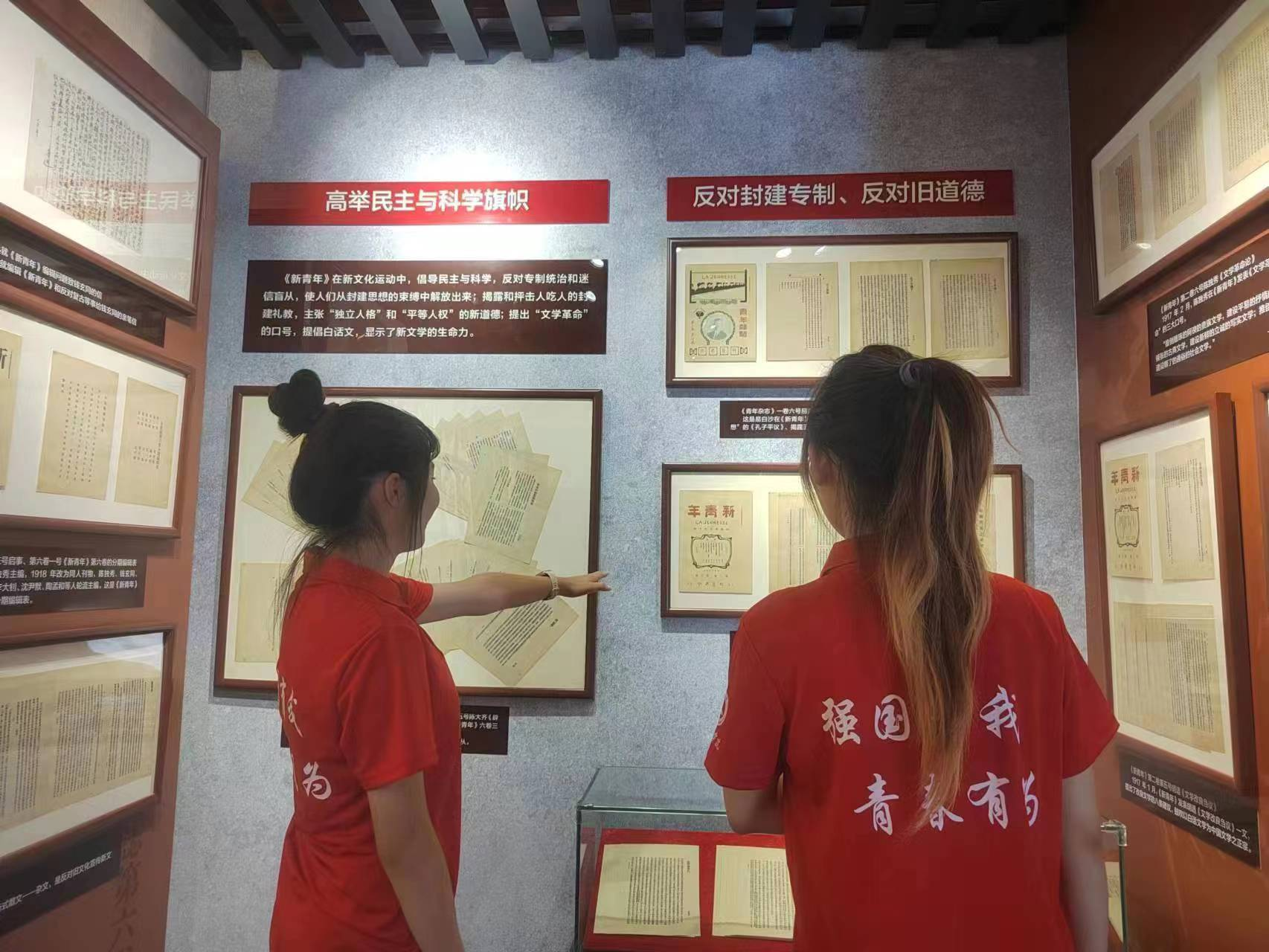 实践团首先参观并学习了有关《新青年》的展览,展览主要介绍了《新青年》的⼏个发展时间段和它所起的作⽤及地位。通过参观成员们学习到《新青年》是顺应时代发展要求的产物,它培育了当时那一代的有志青年,指引着时代前进的步伐。虽然《新青年》存在的时间短暂,但作为马克思主义在中国早期传播的主要载体,它担负并出色地完成了早期中国共产党人向国民宣传自己信仰和主张的特殊使命,忠实地记录着共产党人的初心,对中国共产党创建,对大革命的兴起,有着不可替代的作用。