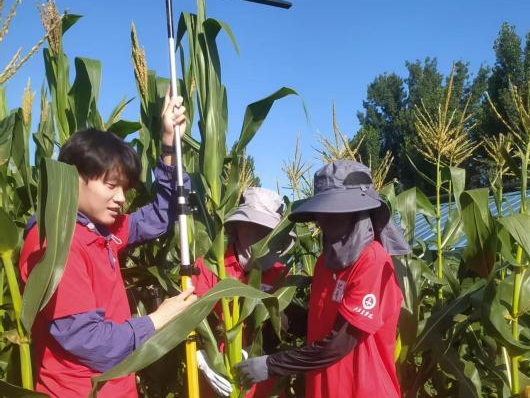 队员们于晴天上午开展玉米株高、茎粗、穗位高等性状的测量,队员们以此推测不同玉米品种的产量构成,为筛选高产优质品种奠定基础。