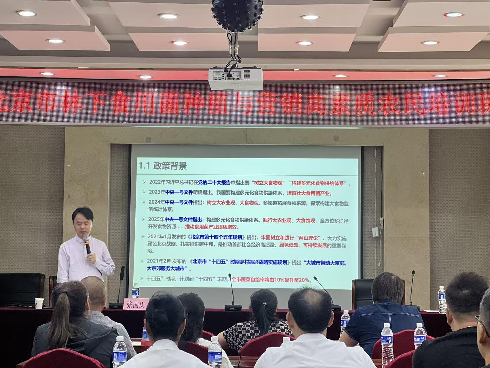 张国庆教授从林下食用菌产业现状、大球盖菇的生物学特性、林下高效栽培技术及病虫害绿色防控等方面,系统阐述了北京地区发展林下大球盖菇的关键技术,为该年度大球盖菇的科学栽培与生产管理提供了重要技术支持。