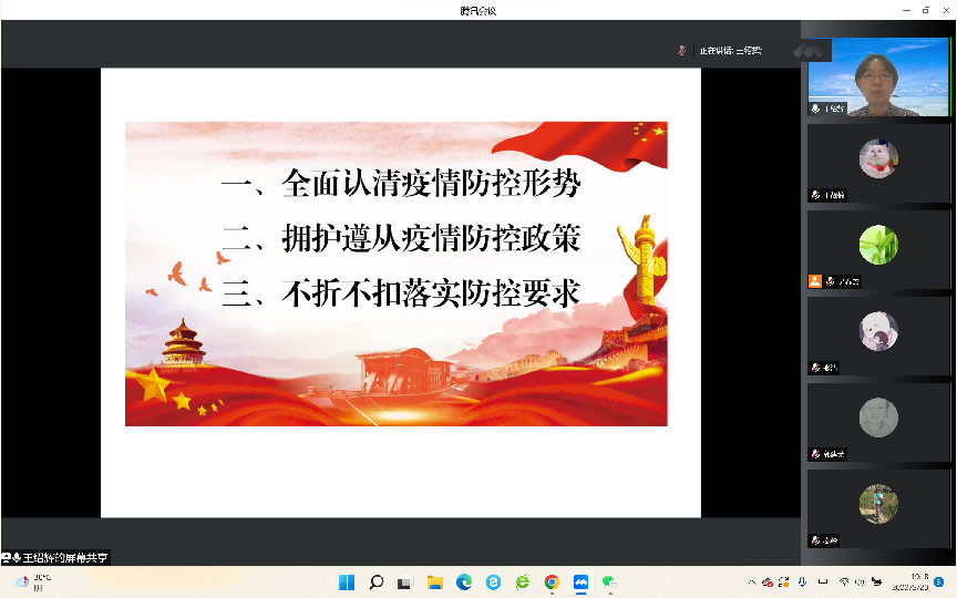 最后,学院领导班子成员与参会师生进行了交流,充分肯定了在校师生在严峻复杂的疫情环境下展现出的强有力的防控思想站位和防控举措执行力,鼓励同学们再接再厉,深入贯彻落实北京市和学校的防疫相关政策,相信全体师生众志成城,一定能早日打赢疫情防控阻击战!
