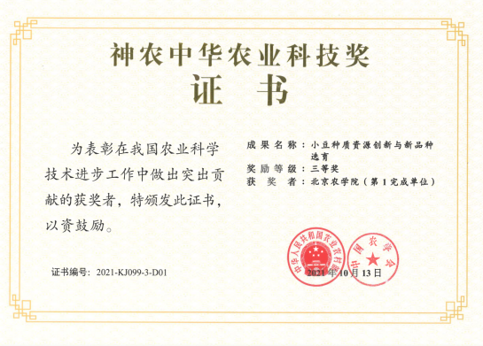 近日,由yl23411永利集团小豆基因组与分子遗传育种团队为第一完成单位组织申报的“小豆种质资源创新与新品种选育”获得农业农村部2020-2021年度神农中华农业科技奖三等奖,联合申报单位有吉林省白城市农科院、山西省农科院、江苏省农科院和辽宁省农科院等。