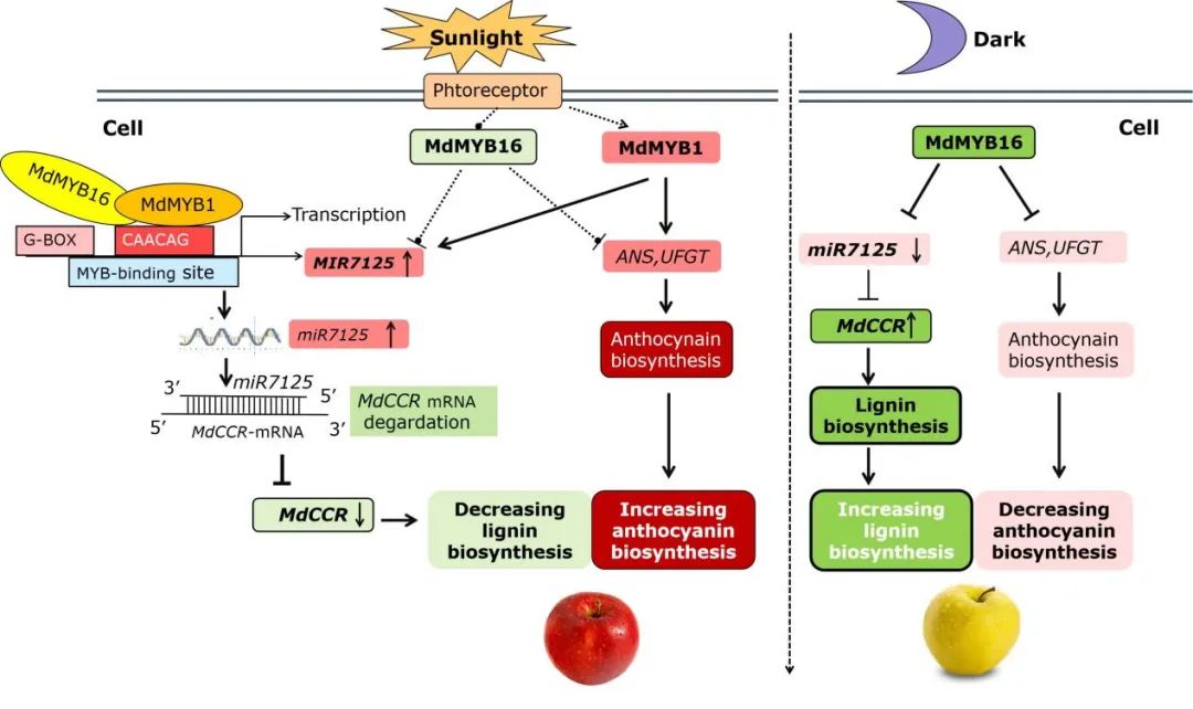 2021年4月28日,New Phytologist在线发表了北京林木分子设计与辅助育种高精尖中心、永利23411集团青年教师胡玉净为第一作者、张杰教授和姚允聪教授为通讯作者的题为“The MdMYB16/MdMYB1‐miR7125‐MdCCR module regulates the homeostasis between anthocyanin and lignin biosynthesis during light induction in apple”的研究论文。该研究揭示了MdMYB16/MdMYB1‐miR7125‐MdCCR模块协同调节光诱导苹果果实花色苷和木质素生物合成之间的稳态。并突出展示了CCR和CHS基因催化共同底物介导木质素和花色苷生物合成的竞争关系,为脱袋后苹果果实快速着色和品质形成分子机制提供了新的认识。