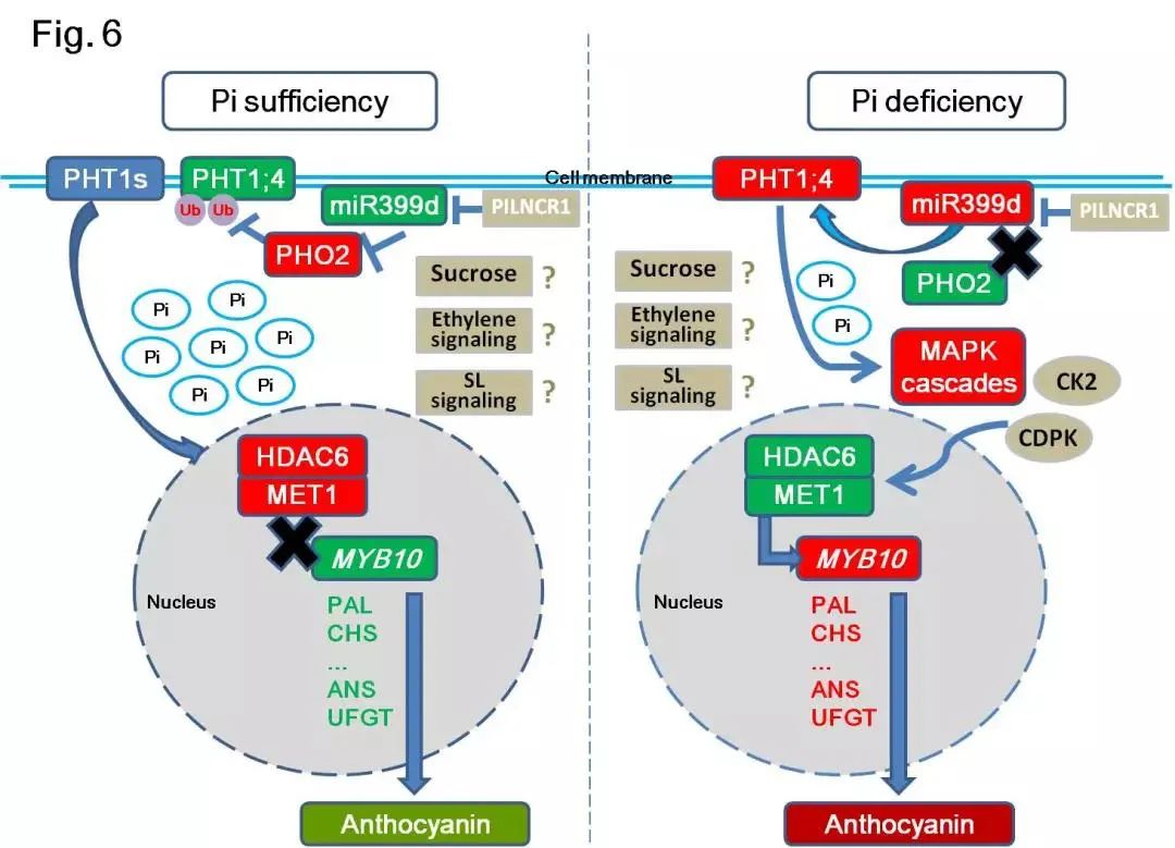 2019年12月13日,Plant Cell and Environment杂志在线发表了yl23411永利集团姚允聪课题组题为“MiR399d and epigenetic modification comodulate anthocyanin accumulation in Malus leaves suffering from phosphorus deficiency”的研究论文。该研究揭示了miR399d、HDA6和MET1共同调控的苹果属叶片缺磷胁迫下花色苷积累的分子机制。