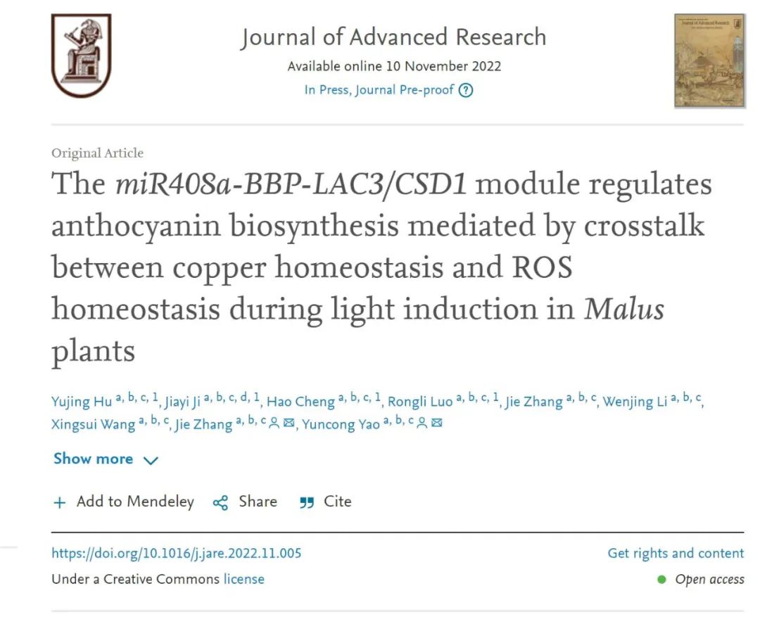 2022年11月10日,Journal of Advanced Research(IF=12.822)在线发表了北京市林木分子设计与辅助育种高精尖中心、yl23411永利集团园艺学科撰写的题为“The miR408a-BBP-LAC3/CSD1 module regulates anthocyanin biosynthesis mediated by crosstalk between copper homeostasis and ROS homeostasis during light induction inMalusplants”的研究论文。